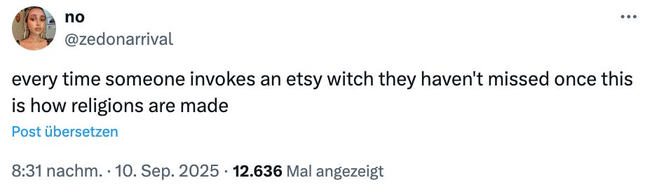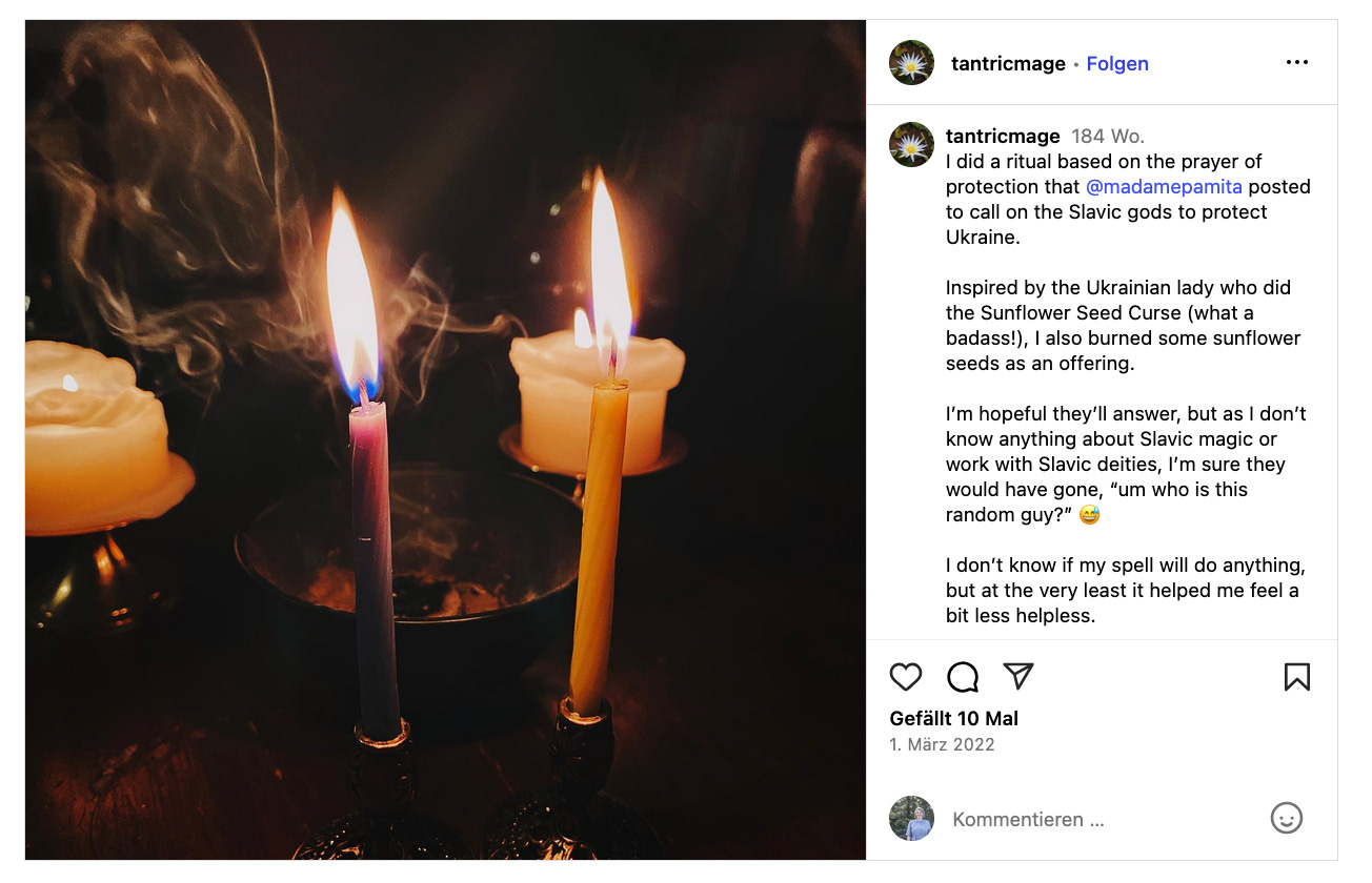 Ich habe in diesem Newsletter schon 2021 über dieses Phänomen geschrieben, als die Hexencommunity in den sozialen Medien mit Zaubersprüchen und Ritualen auf den Krieg in Ukraine reagierte: “Magie ist in den sozialen Medien auch eine ästhetische Praxis: Die Hexen auf Instagram investieren besonders viel Mühe, um ihre Hexenaltare visuell ansprechend zu inszenieren, während die Hexen auf TikTok ihre Magie vor allem performativ inszenieren, in abgefilmter Interaktion mit dem eigenen Hexenaltar, durch die entsprechende Präsentation mit der Selfie-Kamera oder durch ausgiebig inszenierte Gruppenrituale.”