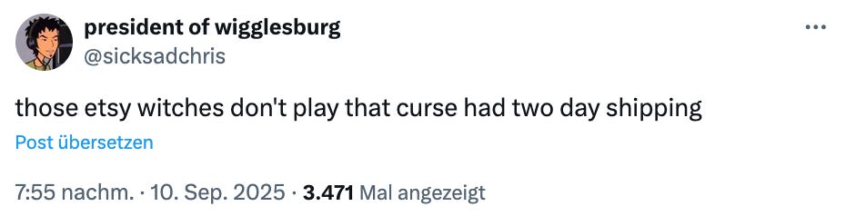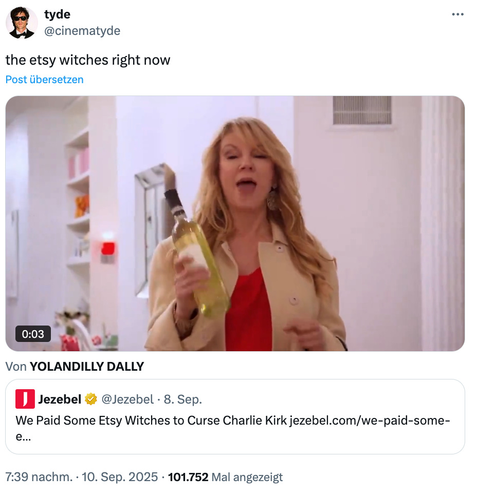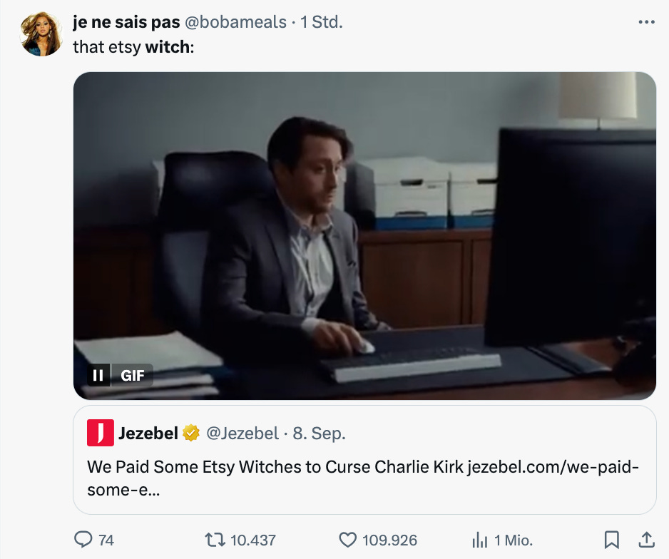 Weil die sozialen Medien aber auch Räume bilden, in denen viel mit Ironie und mehrfachen Bedeutungslayern gearbeitet wird, ist die Verwendung von Magie, von Hexenritualen und Zaubersprüchen immer auch Teil von Internethumor. Dazu gehört beispielsweise, dass das feministische Magazin Jezebel vor einigen Tagen spöttisch eine Etsy-Hexe damit beauftragte den rechten Influencer Charlie Kirk zu verfluchen.