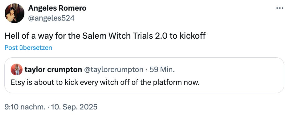 Neben den vielen politischen und sozialen Auswirkungen, die das brutale Attentat auf den rechten Influencer haben wird, führt es vermutlich nun auch zu einer neuen Diskussion um die Hexerei und das Internet. Die Verfluchung von Charlie Kirk durch eine Etsy-Hexe wird sicherlich an vielen Orten eine neue Moralpanik auslösen, rhetorisch von christlichen Fundamentalisten instrumentalisiert werden und an anderen Stellen die Präsenz von Hexenritualen in den sozialen Medien noch verschärfen.