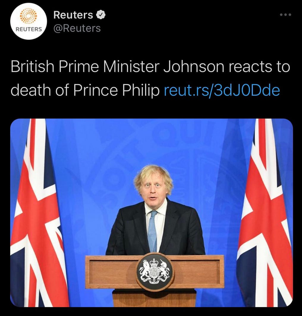 Die Nachrichtenagentur Reuters teilte am 9. April einen Link zu einem Artikel mit einem Bild von Boris Johnson und der Überschrift: “British Prime Minister Boris Johnson reacts to the death of Prince Philip.“ Das Bild war so unglücklich und unfreiwillig komisch, dass der Tweet gelöscht werden musste. Screenshots des Tweets und des Artikels wurden natürlich weiter verbreitet und es gab auch schon einige Weiterbearbeitungen.