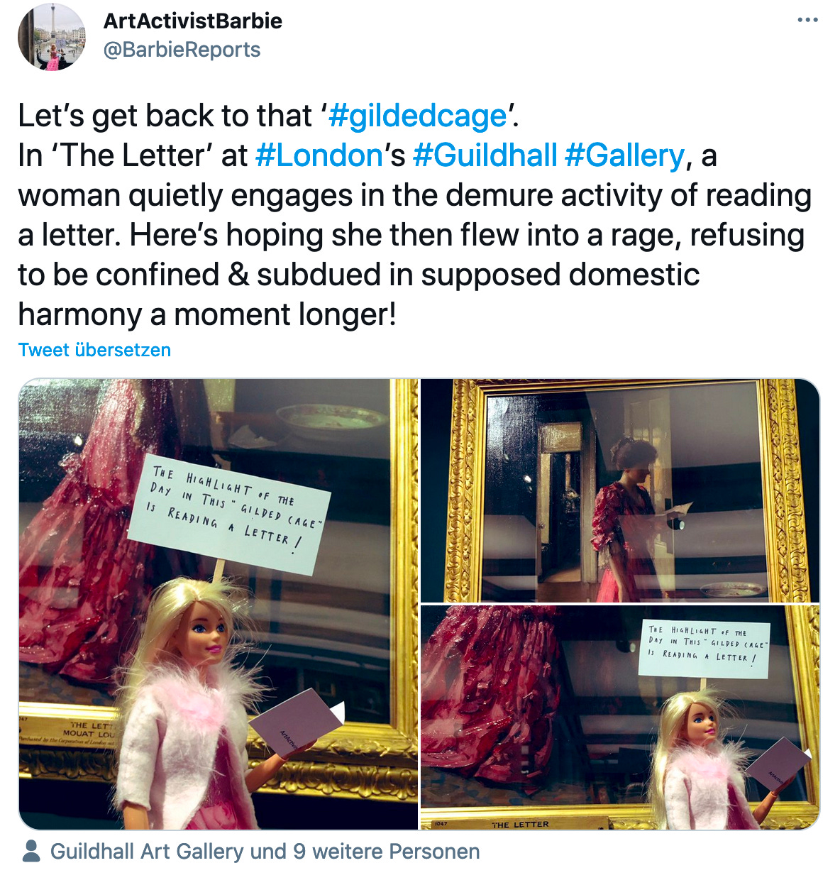 Mit dem Account @BarbieReports berichtet die Art Activist Barbie aus Kunstgalerien und Museen und setzt sich kritisch mit dem dort Gezeigten auseinander. Der Account analysiert dabei nicht nur die Kunst- und Museumswelt, die weiterhin einen starken Genderbias hat, sondern äußert sich auch kritisch zu den Darstellungen von Frauen in den ausgestellten Gemälden. Damit hat es das Kunstprojekt bis in den Guardian geschafft: